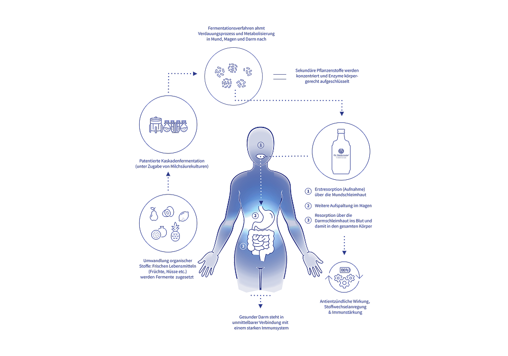 Les enzymes des ingrédients végétaux sont décomposées en leurs plus petits éléments constitutifs enzymatiques et sont présentes dans Regulatessenz® sous le nom de Stammenzyme®. Toutes les substances sont dissoutes dans l’acide lactique dextrogyre, produit naturellement lors de la fermentation en cascade.